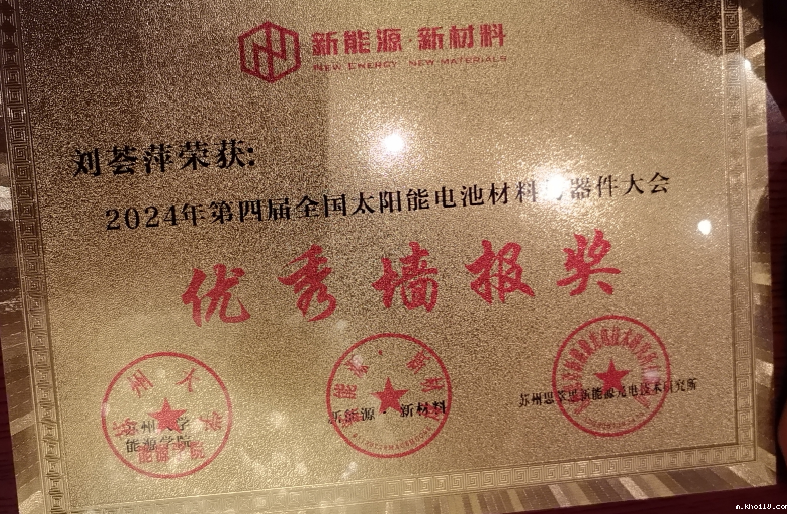 为了提高研究生培养质量,功能与环境材料研究所积极参加国内外学术会议,5月31日至6月2日,第四届全国太阳能电池材料与器件大会在苏州召开。本次会议是我国光伏领域科研工作者的一次专业研讨会,全面展示了中国科研工作者在太阳能电池材料与器件及其产业化等研究领域所取得的最新进展及未来发展方向。王育华教授课题组讲师李天荣,博士生宁福春、丁怡,硕士生刘荟萍、李雅雯参加本次会议,李天荣老师和博士生宁福春分别做了以“对钙钛矿纳米晶光电性能调控的研究”,“金属卤化物钙钛矿材料的生长机制和调控机制”为题的口头汇报,硕士生刘荟萍、李雅雯分别做了“2-溴十六烷酸对CsPbBr3钙钛矿的原位钝化研究”和“基于配体交联策略提升钙钛矿量子点光电性能的研究”为题的墙报展示,硕士生刘荟萍获得“优秀墙报奖”。